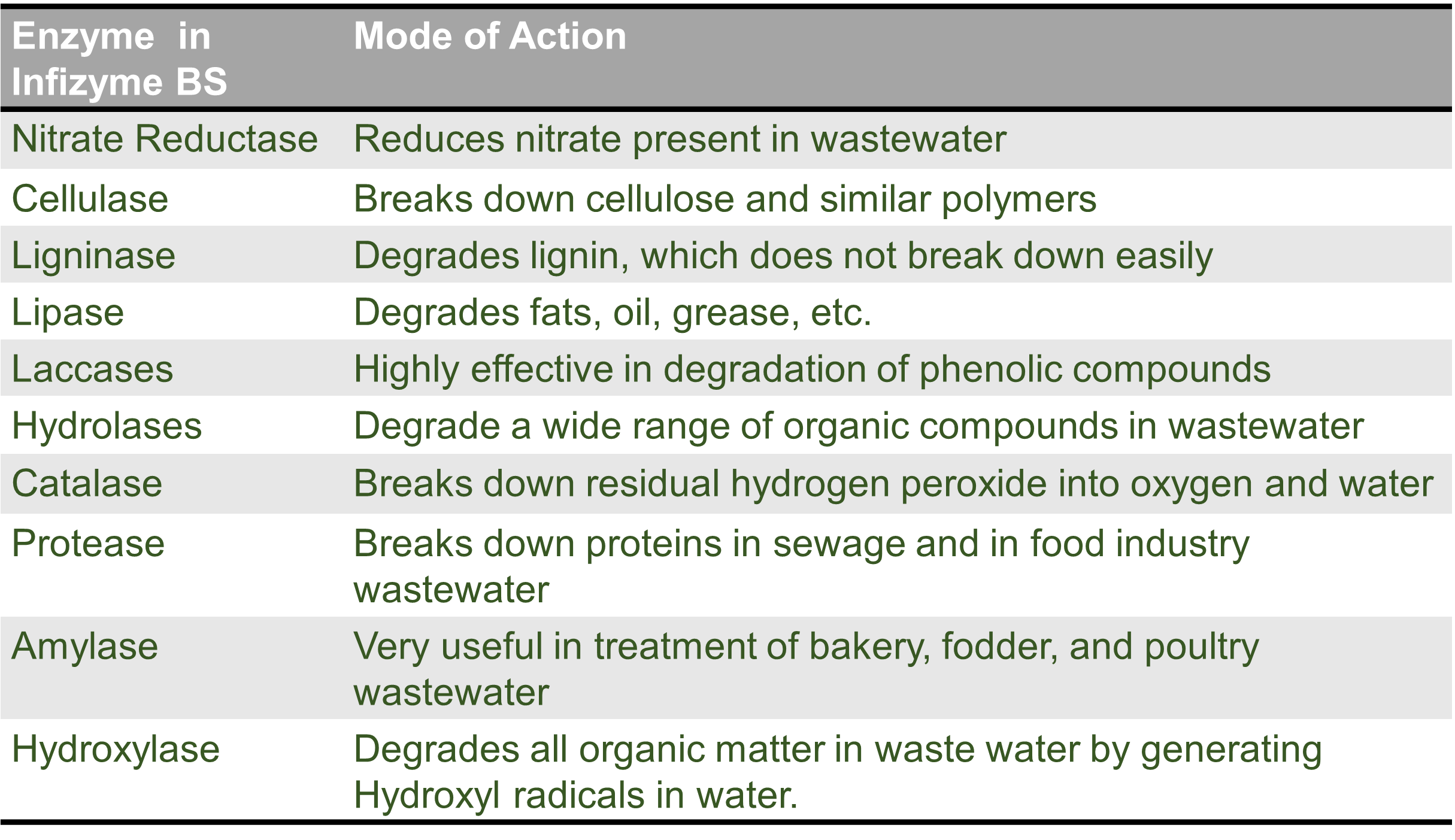 Bacteria present in Infizyme-BS produce a host of enzymes essential for sewage treatment. Here are some of those enzymes and their functions in wastewater treatment. With Infizyme-BS, you do not have to add any additional enzymes for wastewater treatment.